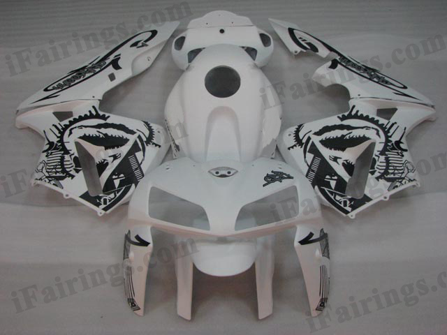 This 2003 2004 Honda CBR600RR fairing kit was painted in black and silver color with tribal flame. This fairing was customized from the original Honda CBR600RR tribal fairing kit by removing the Honda emblem and lettering. If you would like it to be original graphic, you can write it clear in the customize instruction text area and we will make it original theme.