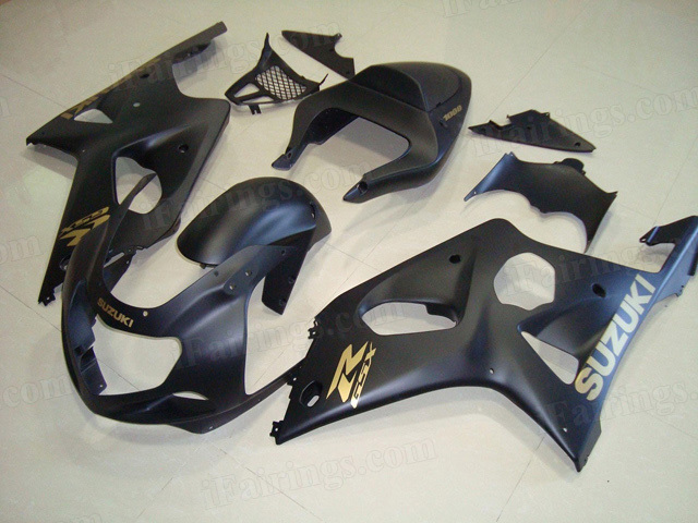 2000 2001 2002 Suzuki GSXR1000 matte black fairings with gold stickers.