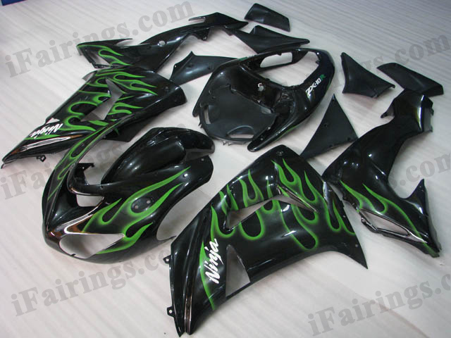 2006 2007 Kawasaki ZX10R black and green flame fairing kits.